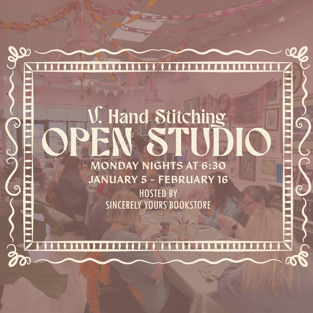 Open Studio is a 6 week period of 2-hour sessions on Monday nights, hosted by Sincerely Yours Bookstore! This is a time for you to bring whatever project you’re working on and enjoy stitching alongside fellow crafters. Some materials are provided & Virginia is there to provide help & direction where needed. This is a beloved class, and we hope you join us!