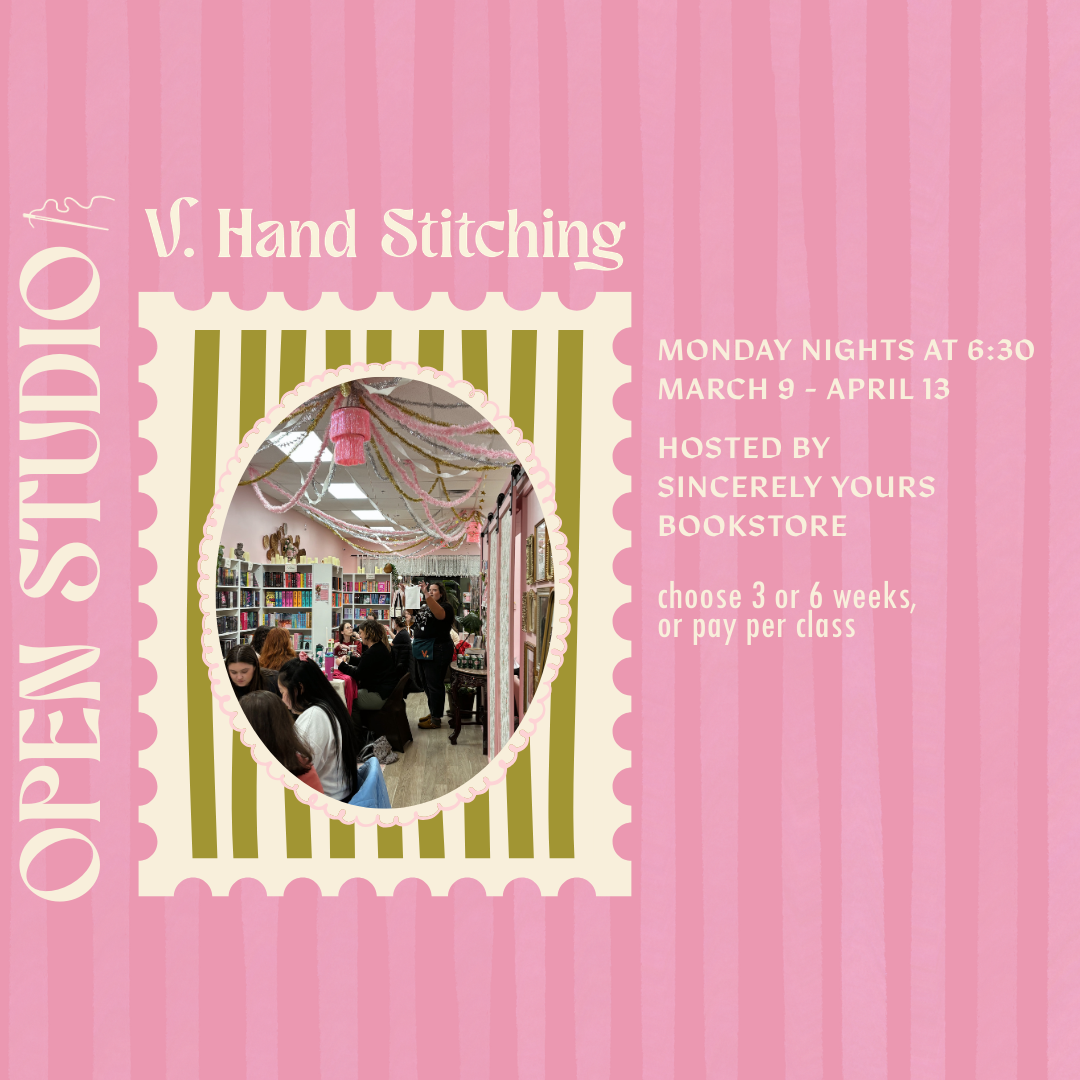 Open Studio is a 6 week period of 2-hour sessions on Monday nights, hosted by Sincerely Yours Bookstore! This is a time for you to bring whatever project you’re working on and enjoy stitching alongside fellow crafters. Some materials are provided & Virginia is there to provide help & direction where needed. Sign up for all 6 sessions, pick 3 that work for you, or pay per class!